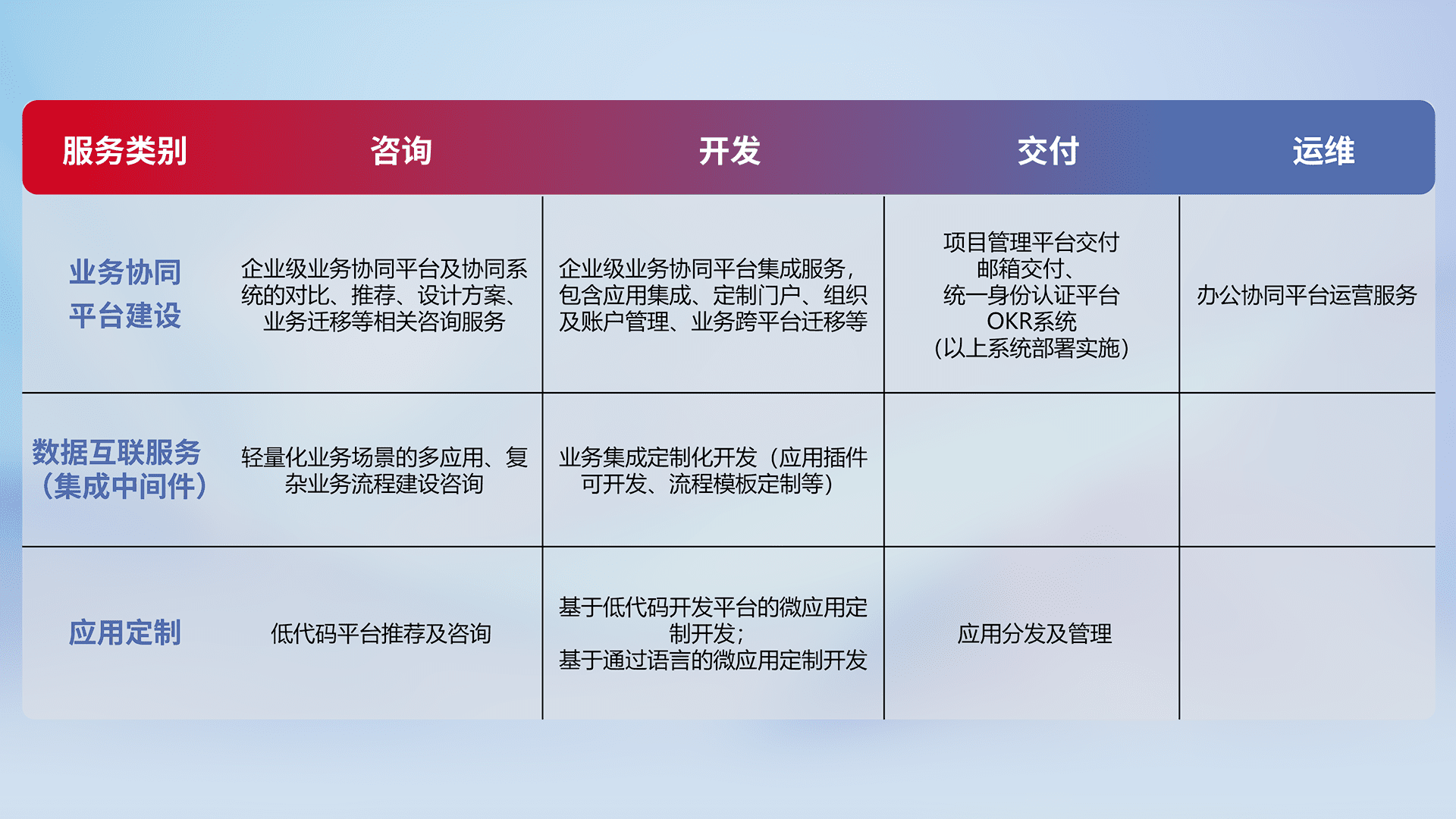 针对钉钉、、、企微、、IDaas等平台级产品提供产品的规划、、方案、、、交付、、定制化开发等服务,,实现如统一协同办公、、、、智能客户服务、、、混合会议管理、、、智能数据查询、、、、等业务场景,,,实现数字化转型。。。。
