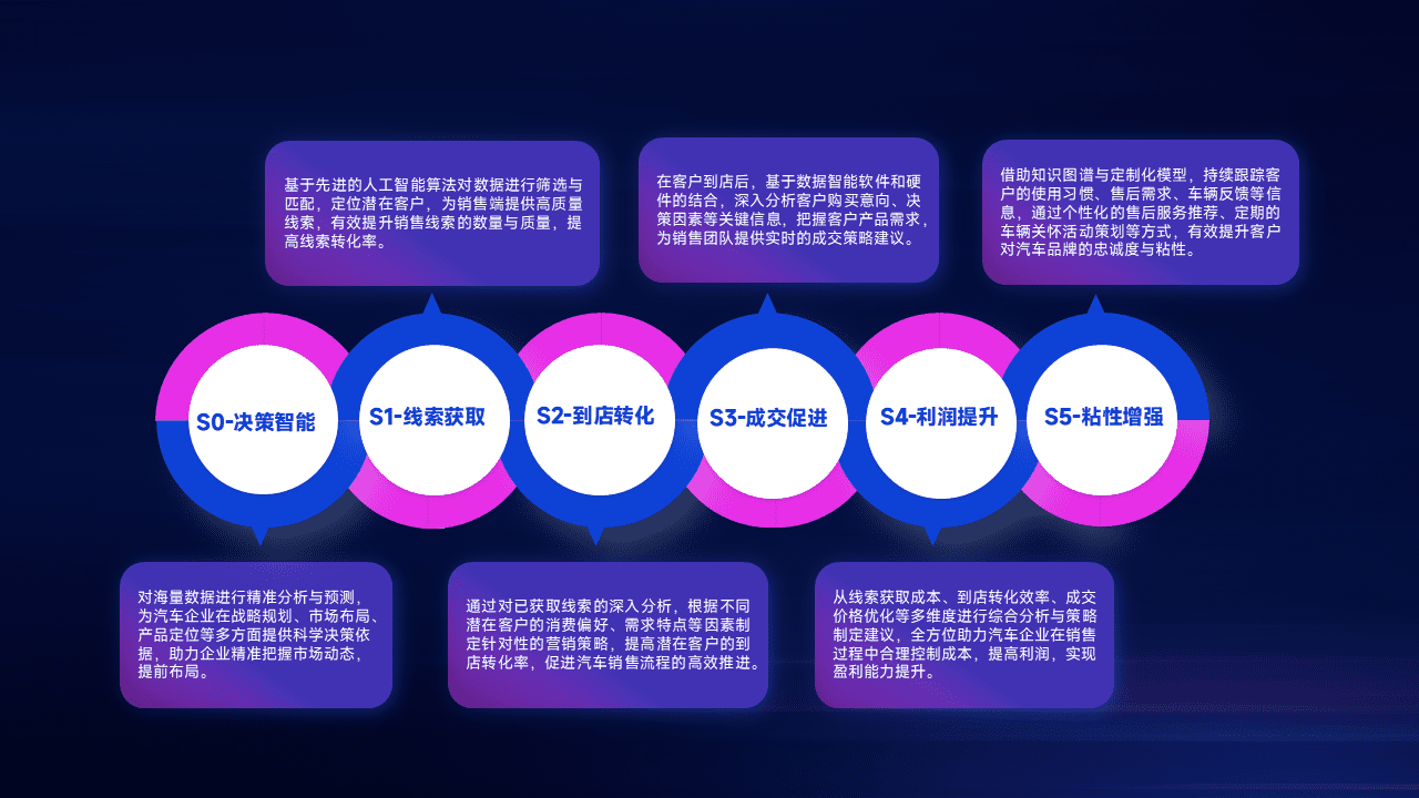 通过拓宽潜在客户来源、、优化线索分配并提高到店转化率,,,,以增强销售效率。。同时,,,,利用线索数据不断优化分析模型,,有效提升转化率,,,扩大营销影响力。。。